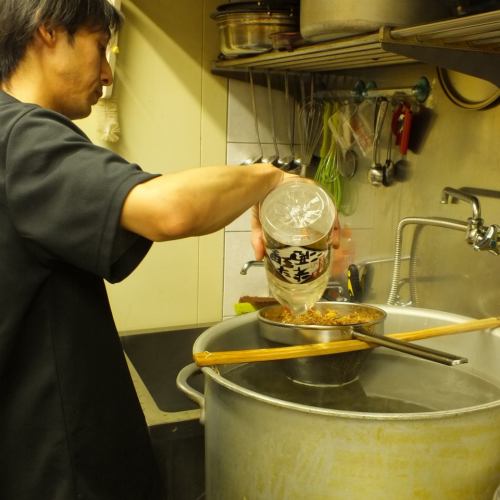 昆布出汁をとり、カツオ・酒・みりんを加え